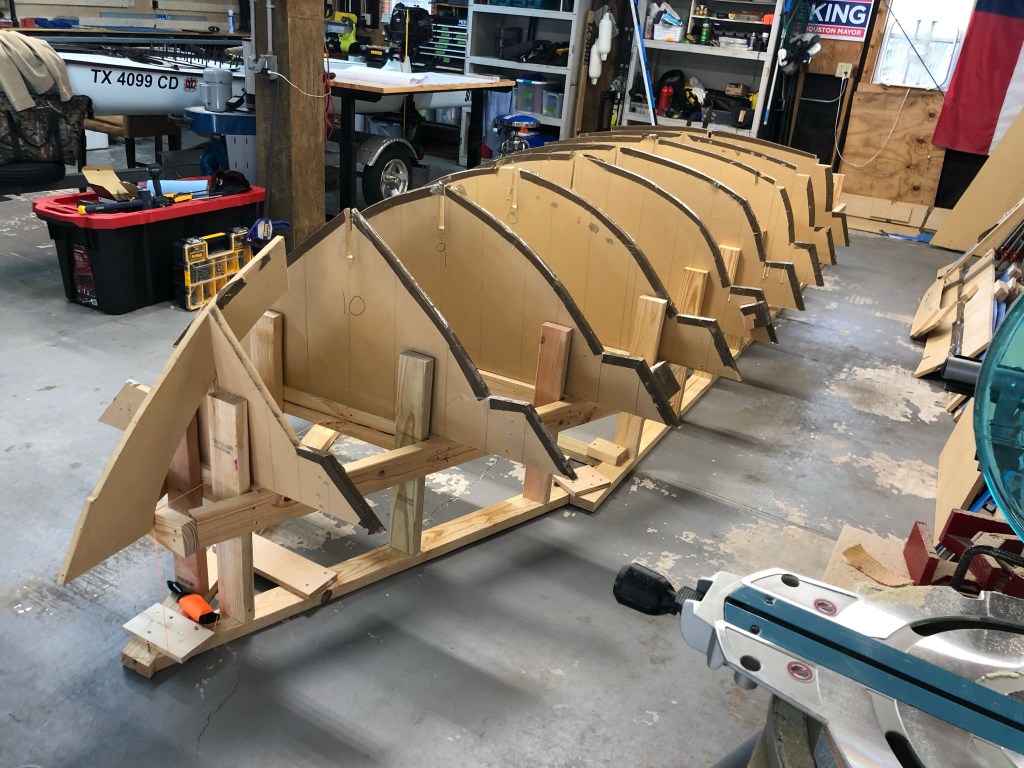 Laying out some of the material I bought to check specs/fit. The pieces that go across the strongback are referred to as “stations” and will shape the hull.