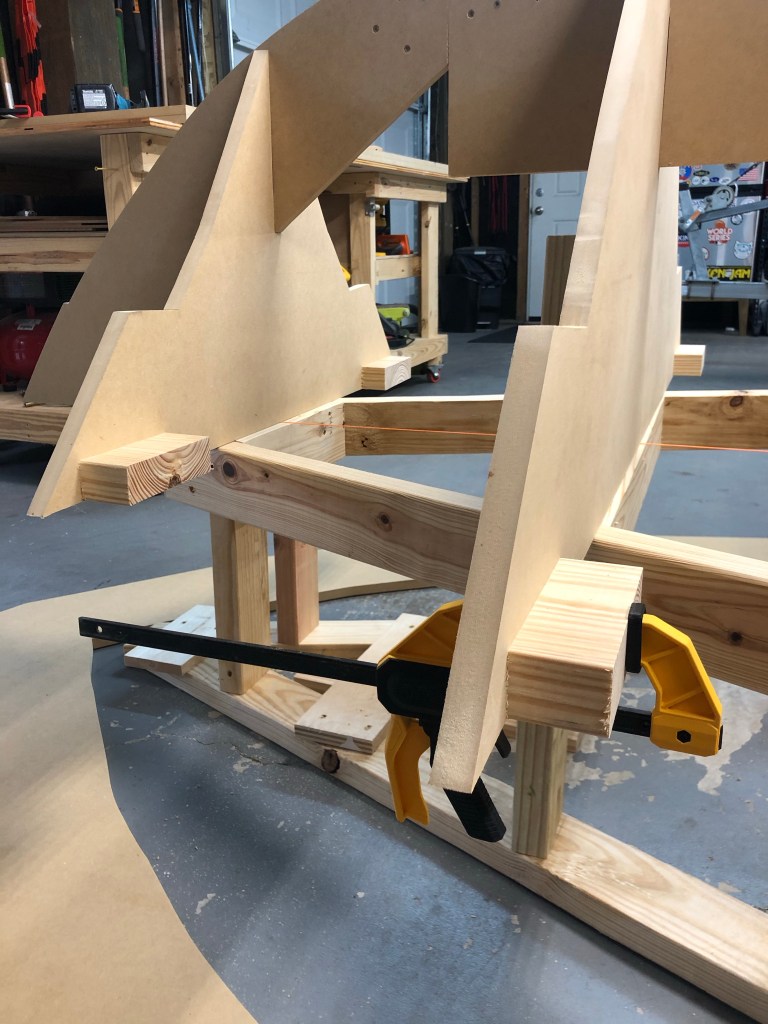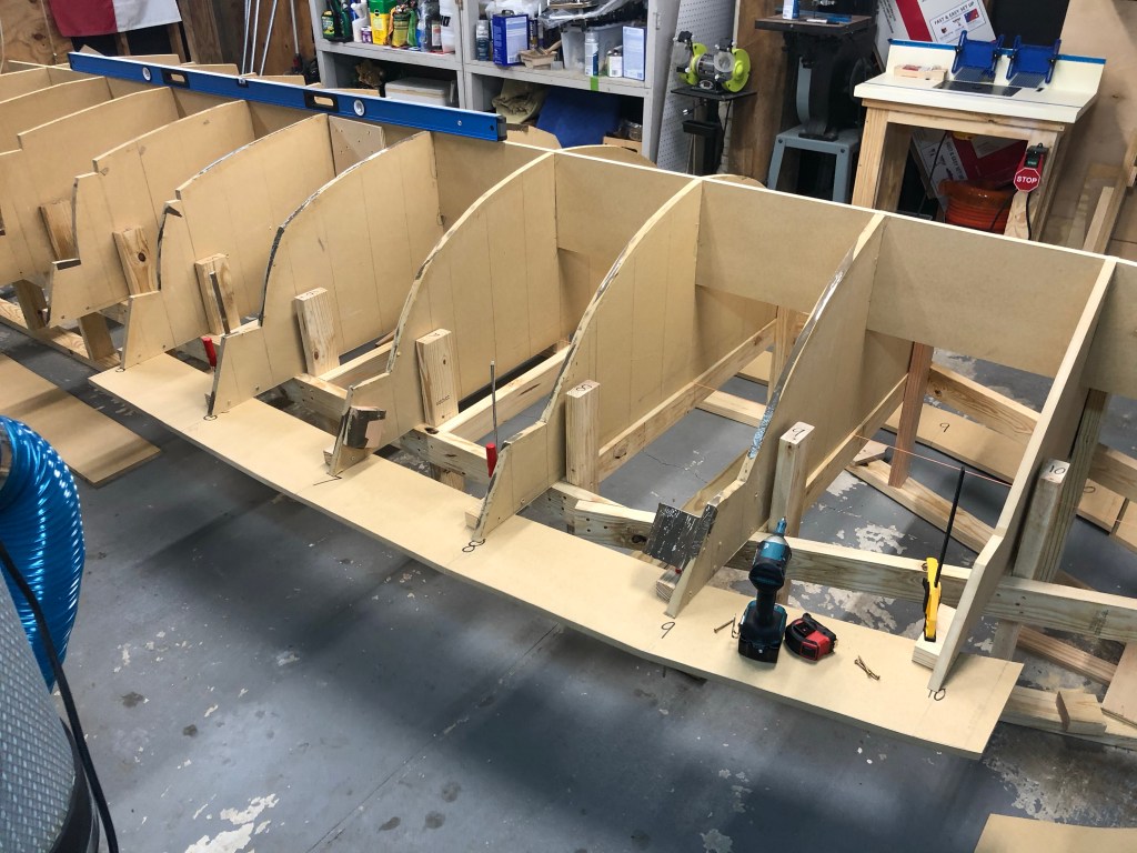 So now that I have the sheer flange secured, next step is to get the entire thing level and to fasten the stations to the strong back.