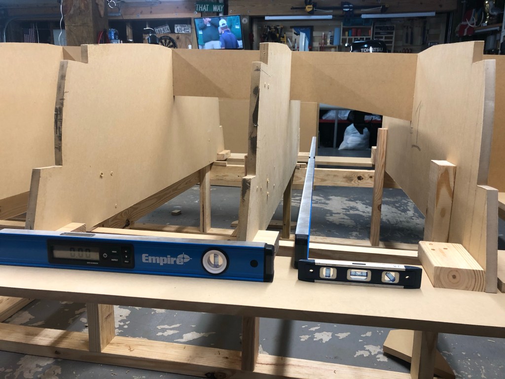 I set the laser up off the mid-ship starboard and had it project a horizontal line. I grabbed a box level because it’s straight and can stand, and set it on the aft station on the sheer flange. I marked a line on the level where the laser hit. Then it was as easy as moving the level to different points along the sheer and adjusting the station heights with shims up and down until every location I put the level had the laser land perfectly on my mark.