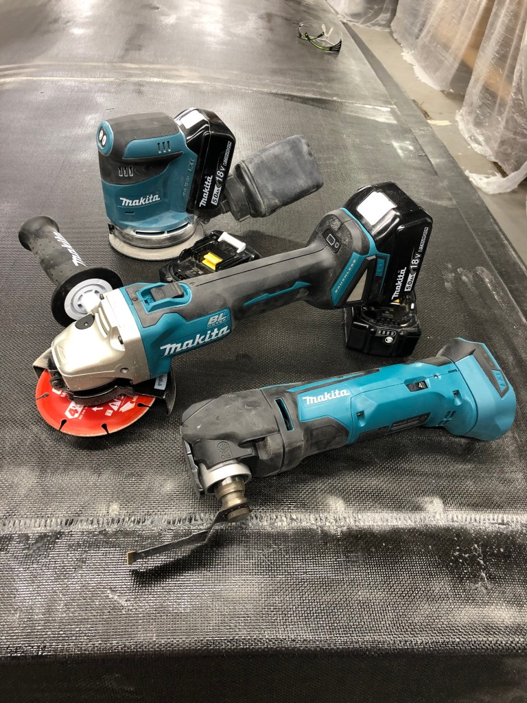 You can see in the picture that I have multiple long sanding boards. Most times it just feels more controlled to do by hand. In some areas I sanded down to these little voids. I’m guessing this is because I had too much air in the mixture. Likely I had too much fairing compound and and not enough epoxy. I ended up sanding this down and then filling it with more (better proportioned fairing compound/epoxy)Another super handy tool is the file sander. This one is pneumatic and required that I upgrade my air compressor in order to be able to continuously operate it. After I knocked down the easy to find high spots, Then it was time to deal with the low spots. To do this, I mixed up some more fairing compound and pulled a straight edge over it to try and blend it in. You can see in the picture all the fresh areas from filling the low spots. This process gets repeated a bunch. I don’t know how many times I did this because I lost track.