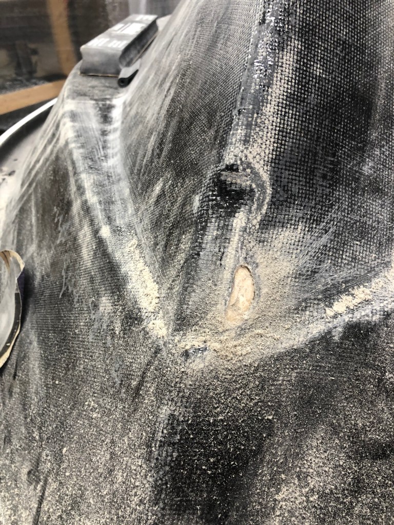 Here are a few spots where the material pulled off the skiff on the edges. It was pretty easy to find them when sanding, the spots that have voids beneath them sand very easy and give away when you put pressure on them. Here is a all the way through bubble right next to the bow eye location. Not a great spot! No fear though, it gets a quality patch job. This was a long one that ran down the lower chine. I’m sure we were focused on the bottom near the sheer flange and pulled the basalt tight and forgot to check the area pictured above. Here are the finished repairs. In order to keep the same thickness, I cut three pieces of basalt each a different size, and epoxied them over the cleaned up holes. It’s important to get all the air pocket out (even if that takes you back to the core) and all the debris gone before making the repair.