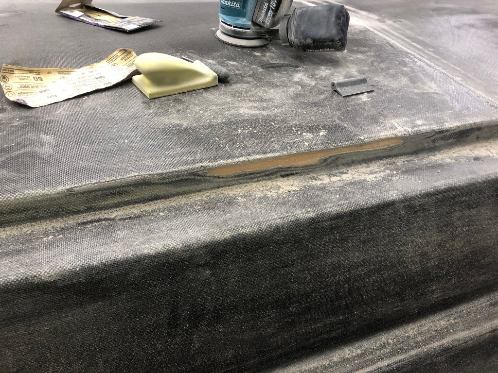 Next was giving the hull a a light sanding. This is to give the fairing compound something to stick to as well as find the inevitable bubbles where the epoxy did not get fully saturated or the basalt pulled away from the core and created a void. Bubble show themselves much easier once the surface has been sanded. There were a couple of areas that had bubbles and the causes were the same. Corners were too tight and basalt slowly pulled away as it cured.