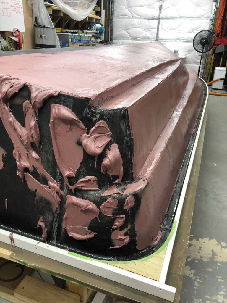 Fairing starts with coving the hull in a sandable yet durable compound. It sounds a bit paradoxical to be easy to sand and durable but this is where you get your variety on material that can be used as the faring compound. With all the oyster rash that’s inevitable for someone on the Texas Gulf Coat, I wanted to go with something more durable than just glass bubbles and epoxy so I opted to use a product called the SM Fairing Compound by US Composites. SM fair has some additives that give it some additional strength as well as a reddish pigment that I think makes it easier to see the undulations and imperfections. It is a pain in the butt to sand though and I hope that all the extra sanding will prove worth it in the end.