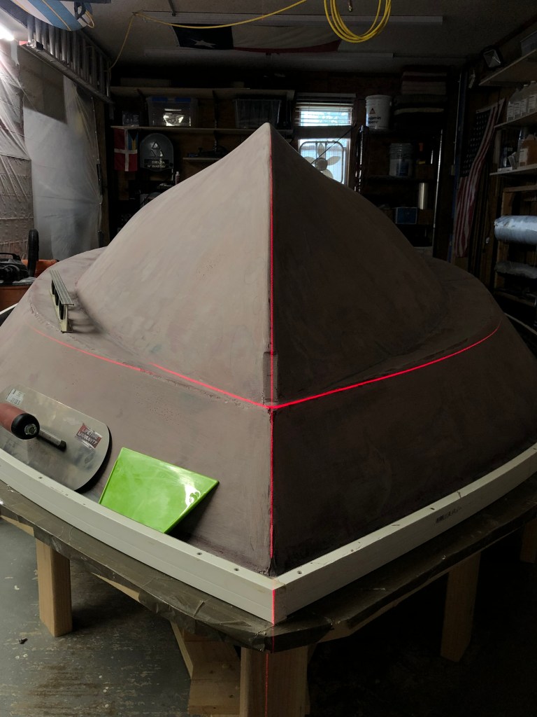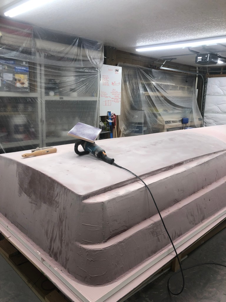 Step four is to frost the cake! The hull is not smooth right now. There are the overlaps in the basalt and imperfections in the foam and form shape that have made their way through. If you were to paint the skiff right now, it would look really bad. So in order to make it smooth to the eye and cut through the water with minimal drag, it needs to be faired smooth.
