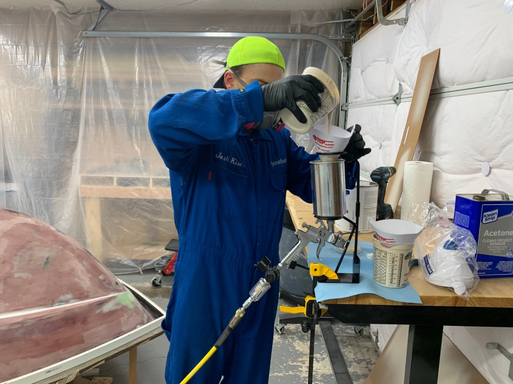 The paint is a two part system, mix by volume one part Base with one part Converter and desired percentage of reducer to a smooth mixture. Then the paint has to sit at least 15 minutes for what’s known as an induction period before using. While the two parts are getting to know each other, this is a great time to give the surface to be painted, one more good wipe down with your cleaning solution and tack cloth. Make sure whatever you use to wipe it down has fully flashed off before beginning to paint. After the induction period is up, I gave it another mix and poured it through a fine paint strainer directly into my paint gun.